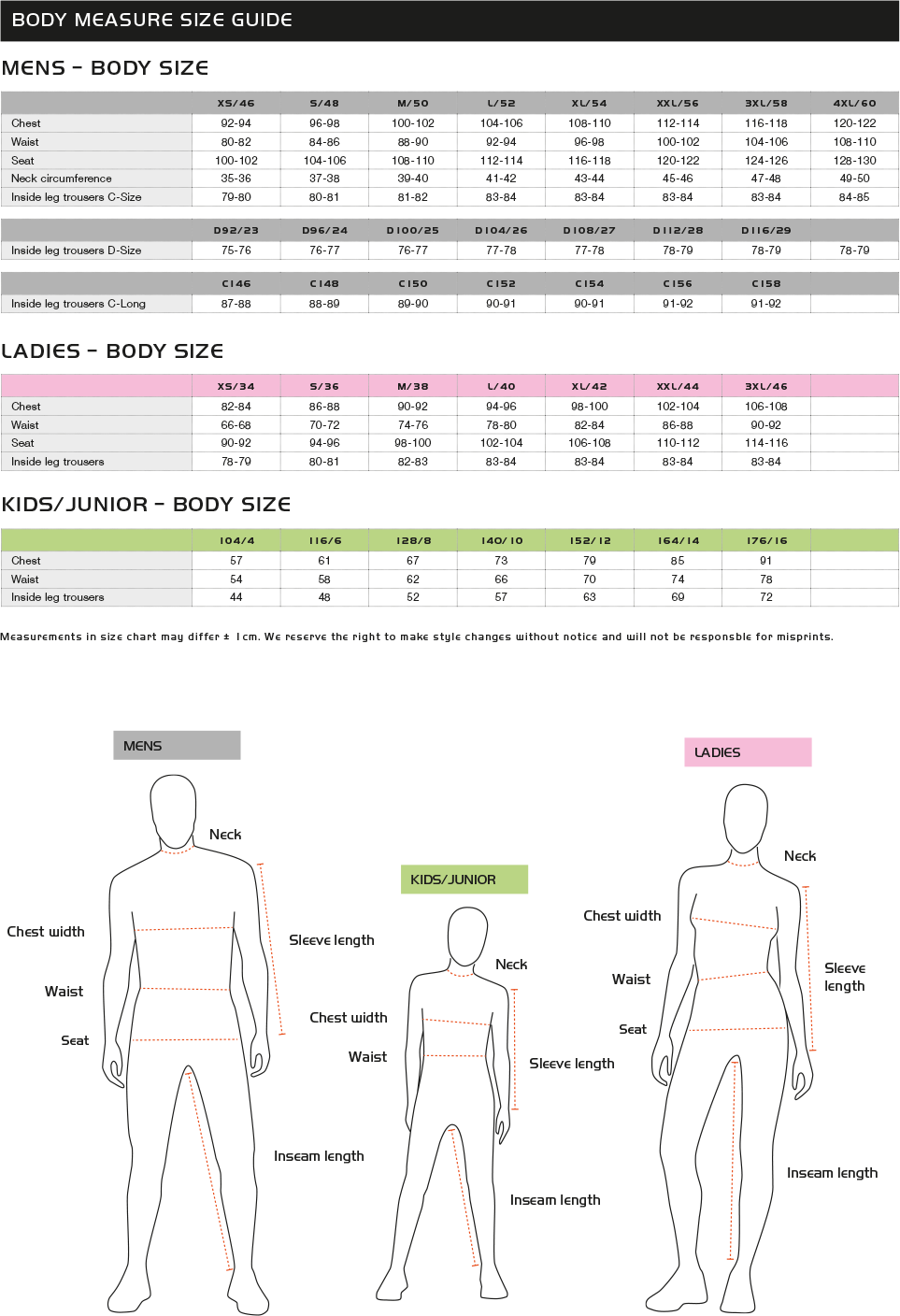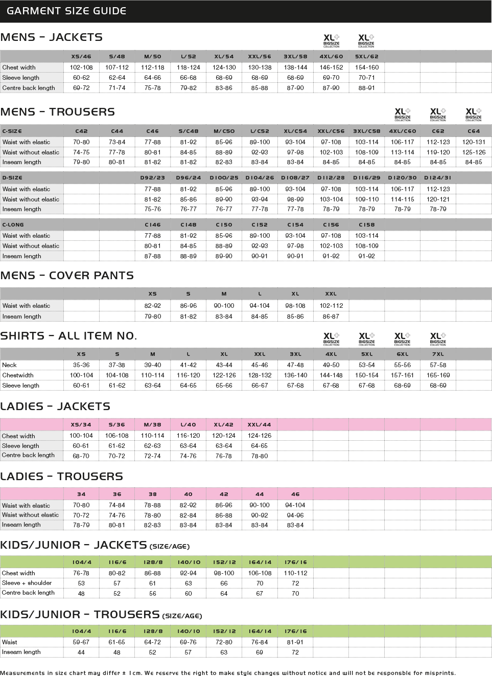 Pinewood - сравнительные размеры одежды
