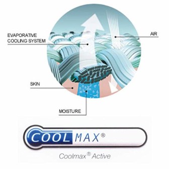 За счет уникального строения волокон свойства Coolmax сохраняются даже после длительного использования. Coolmax высыхает в 2 раза быстрее хлопка, намного лучше «дышит». Для ухода за изделиями из Coolmax не требуется специальных моющих средств. Простой уход за изделиями из Coolmax. Coolmax на 50% мягче хлопка, а также он очень приятен на ощупь. При использовании в изделиях Coolmax в сочетании c Lycra достигается наилучшее прилегание материала к телу, и кроме комфорта улучшаются влагоотводящие свойства изделия. Материал Coolmax отлично отводит влагу, поэтому изделия из этого материала предназначены для больших физических нагрузках. Coolmax - это идеальный материал для занятий спортом с высокими нагрузками.